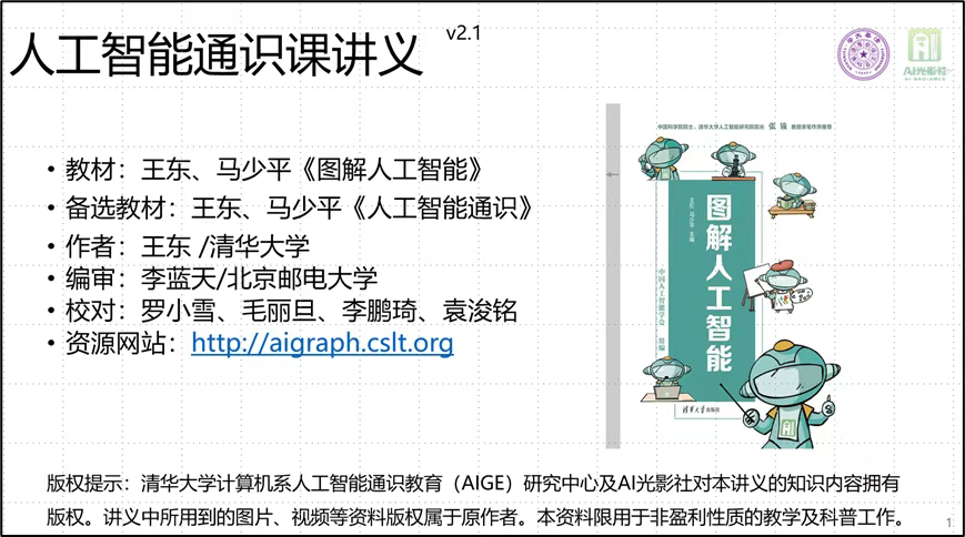 为满足大学本科(含高职)开设人工智能通识课的需求,清华大学人工智能通识教育(AIGE)研究中心和AI光影社发布《人工智能通识课讲义》2.1版。该资料可以用于大学本科/高职院校所有专业的人工智能通识课教学,也可用于对人工智能感兴趣的初学者自学。